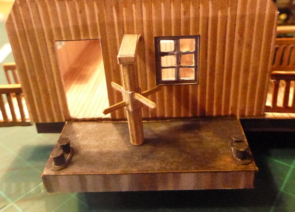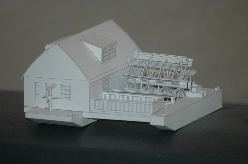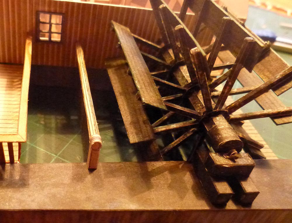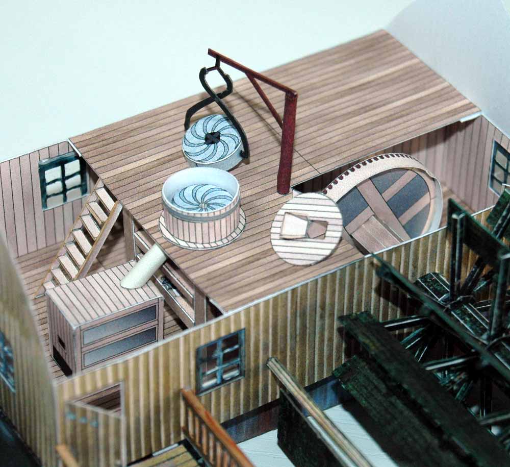 Der Schiffskörper der neuen Mühle mit dem großen Hausschiff und dem kleineren Wellschiff, das als Auflager für die Wasserradwelle dient, bestehen aus Stahl, ein Zugeständnis an die Moderne.