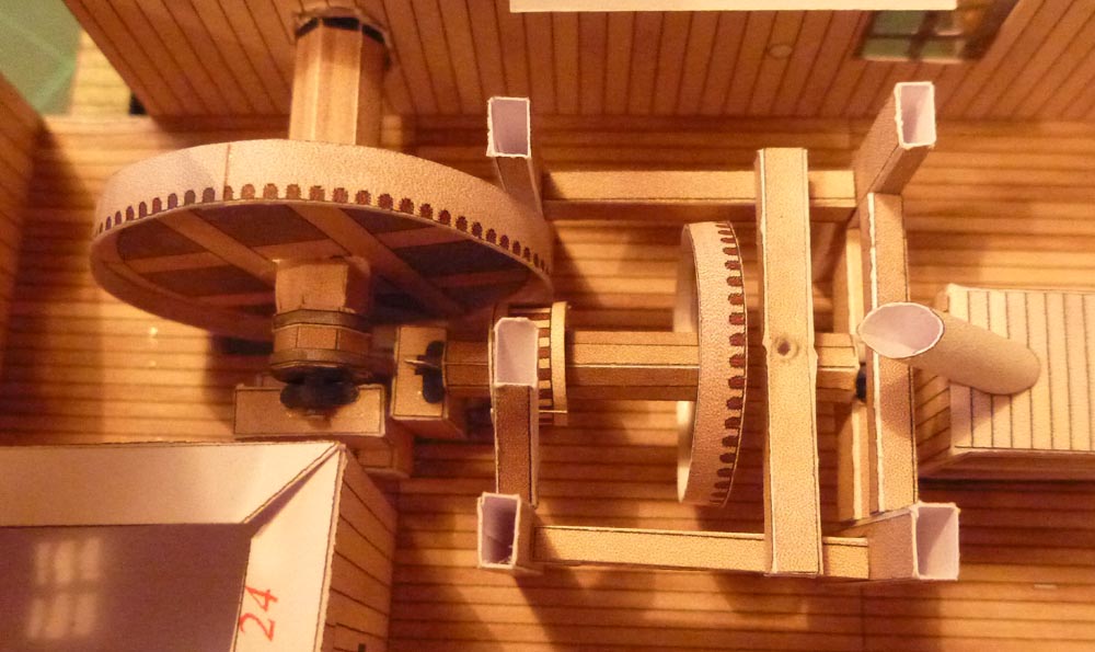 Über zwei weitere Wellen wird die Kraft auf den Mühlstein übertragen und dieser gleizeitig in eine viel schnellere Rotation versetzt als das Wasserrad vorlegt.