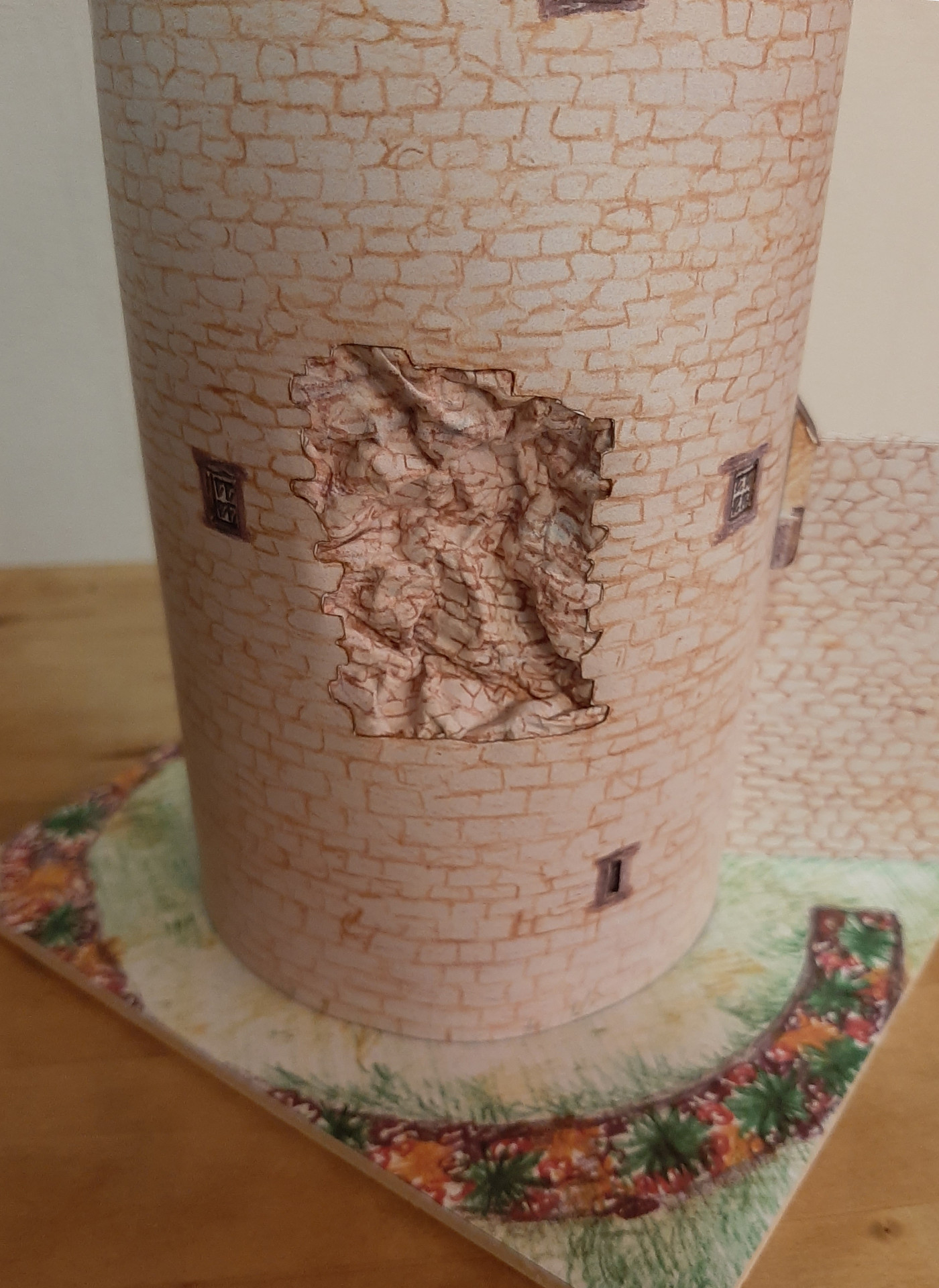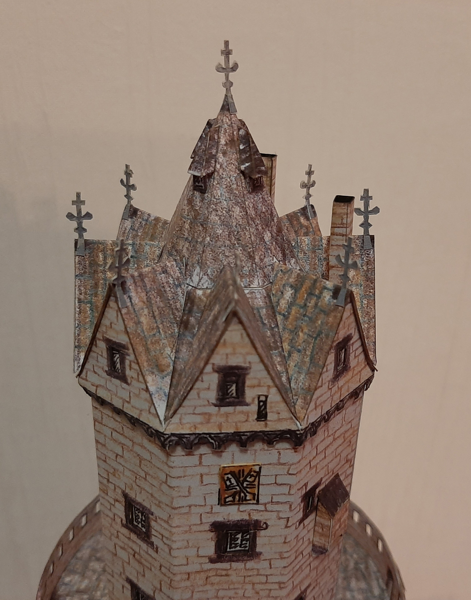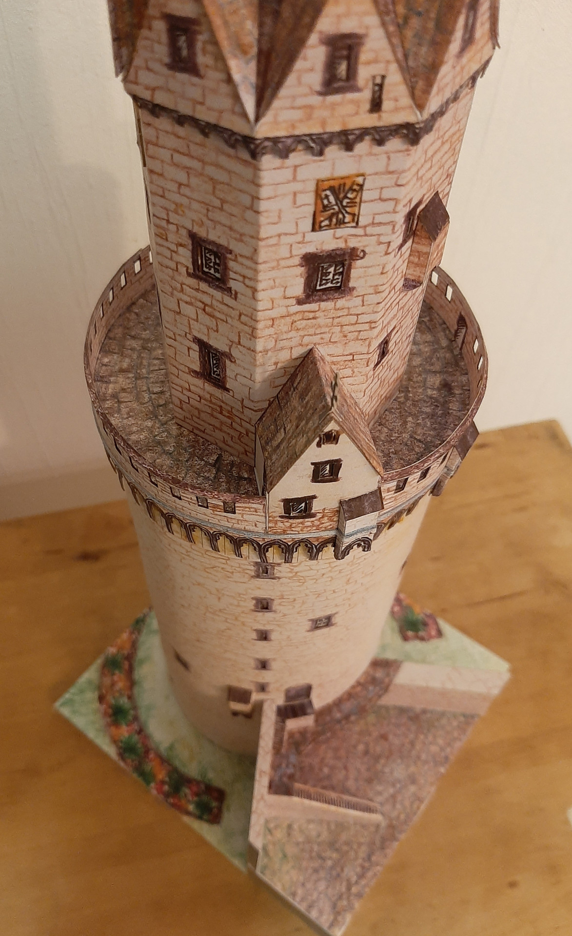 Das Modell vom Runden Turm entstand anlässlich eines Wettbewerbs im Forum Kartonbau.de. Mein Mann hatte sich zur Teilnahme einen Turm von mir gewünscht und unsere Wahl fiel auf den Runden Turm von Andernach, ein Teil der alten Stadtbefestigung. Auschlaggebend dafür war zum Einen die interessante Form unten rund und oben achteckig, zum Anderen das große Loch an der Seite des Turms, dass mir interessant erschien nachzubilden. Das Modell entstand in den Weihnachtsfeiertagen 2020 und wurde von den Forenmitgliedern am Schluss sogar auf den 2. Platz gewählt. Wie bei meinen Leuchttürme auch ist die Konstruktion am Computer mit CAD gezeichnet, die Grafik jedoch ist Handarbeit, die gescannt und in den Bauteilen platziert wird. Leider war der Maßstab 1:100 etwas zu groß, bzw. das Modell - daher haben wir den Turm im zur Spur N passenden Maßstab 1:160 gebaut und natürlich auch 1:250.