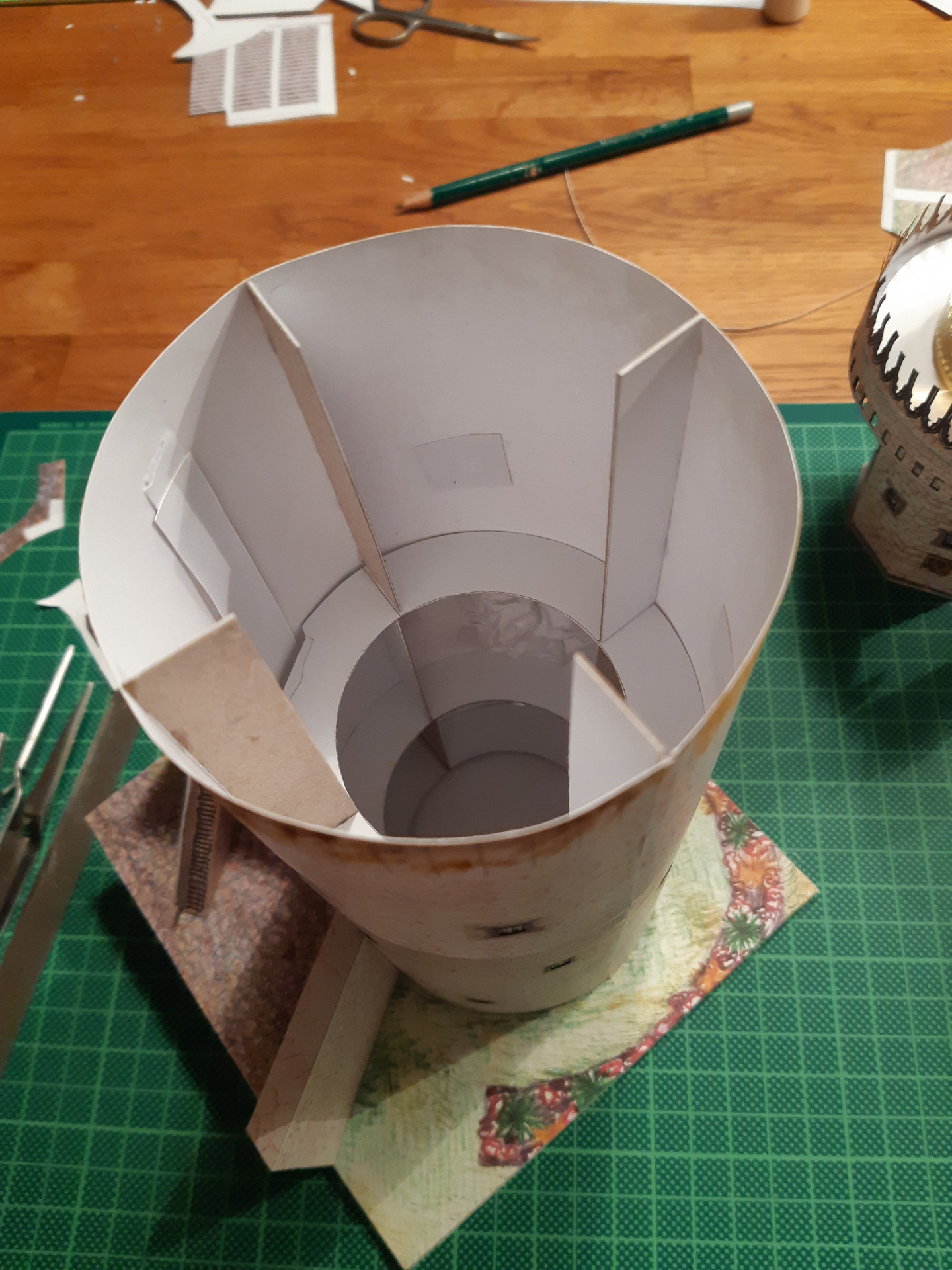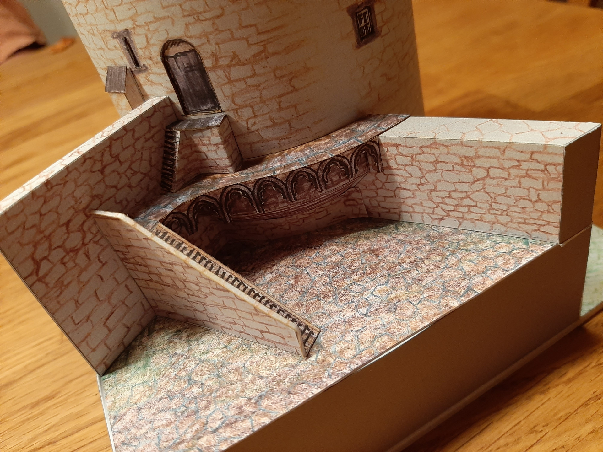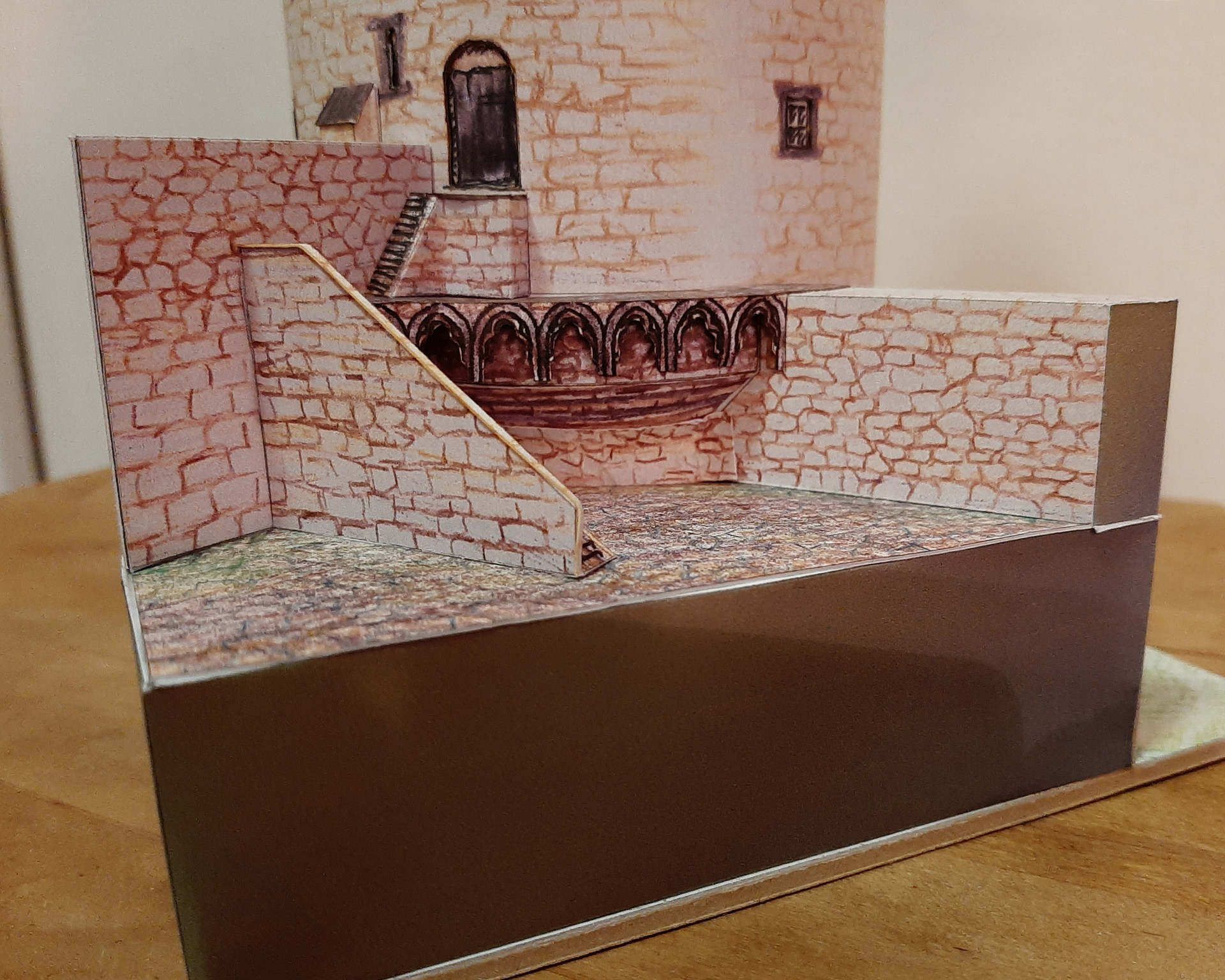 Das Modell vom Runden Turm entstand anlässlich eines Wettbewerbs im Forum Kartonbau.de. Mein Mann hatte sich zur Teilnahme einen Turm von mir gewünscht und unsere Wahl fiel auf den Runden Turm von Andernach, ein Teil der alten Stadtbefestigung. Auschlaggebend dafür war zum Einen die interessante Form unten rund und oben achteckig, zum Anderen das große Loch an der Seite des Turms, dass mir interessant erschien nachzubilden. Das Modell entstand in den Weihnachtsfeiertagen 2020 und wurde von den Forenmitgliedern am Schluss sogar auf den 2. Platz gewählt. Wie bei meinen Leuchttürme auch ist die Konstruktion am Computer mit CAD gezeichnet, die Grafik jedoch ist Handarbeit, die gescannt und in den Bauteilen platziert wird. Leider war der Maßstab 1:100 etwas zu groß, bzw. das Modell - daher haben wir den Turm im zur Spur N passenden Maßstab 1:160 gebaut und natürlich auch 1:250.