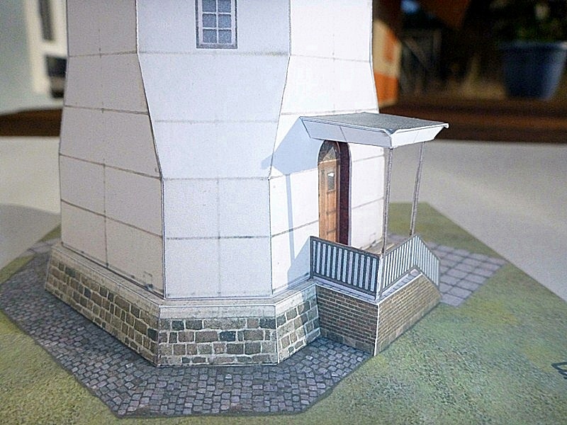 Die Grafik ist auch bei Flügge aus Originalfotos bearbeitet worden. Da mein Besuch in Fehmarn schon eine Weile her ist zeigt das Modell noch das Aussehen des Turms vor der Sanierung. Heute ist das Ziegelmauerwerk wieder zu sehen, das vorher durch die Kunststoffverkleidung verdeckt war.