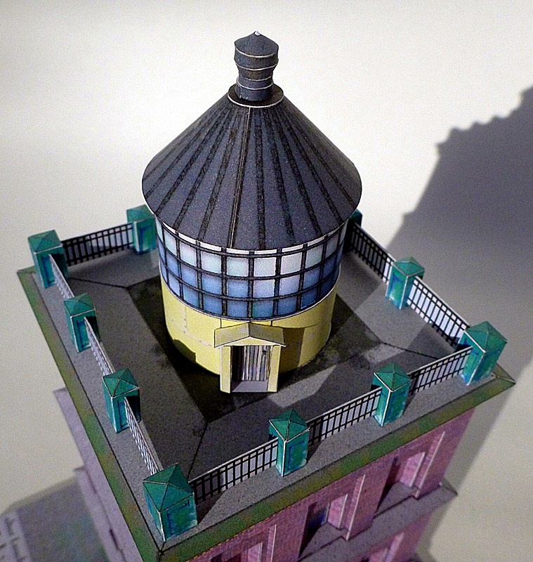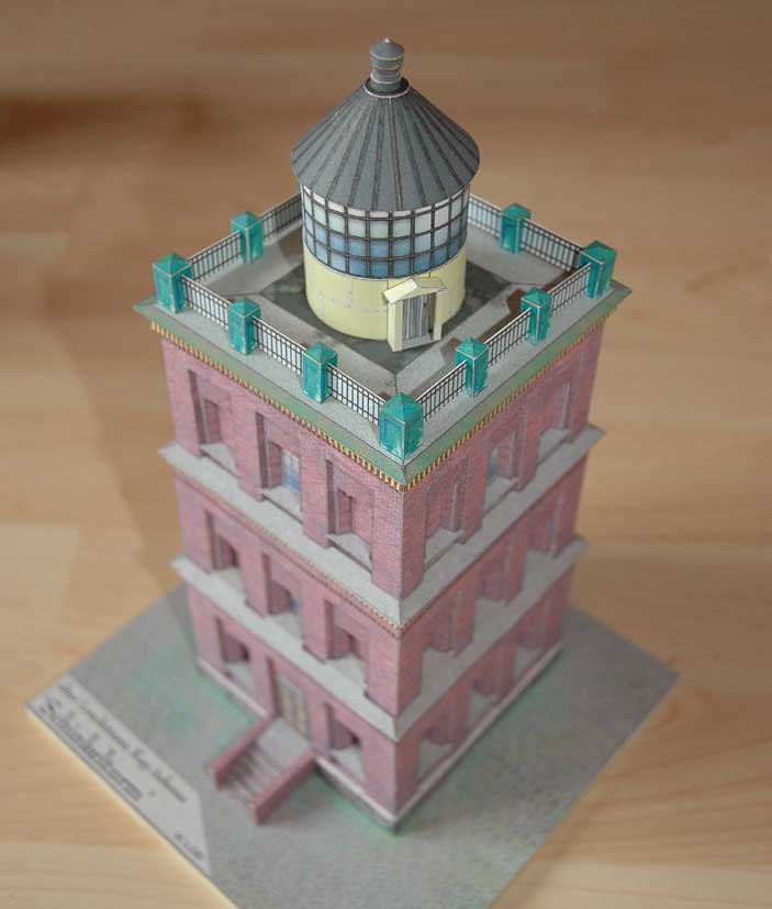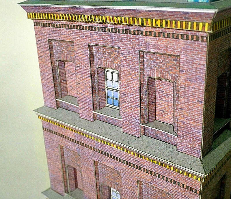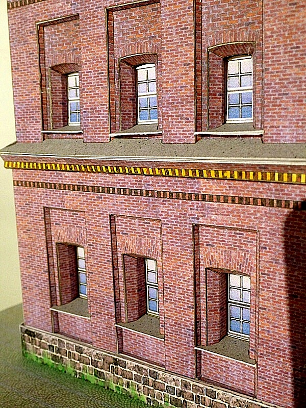 Das 1:100 Modell ist wegen der doppelt zurückgesetzen Fenster etwas aufwändig zu bauen. In der 1:250-fassung sind diese nur plan hinterklebt. Dadurch wirkt die Fassade des Turms sehr schön strukturiert.