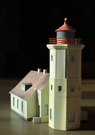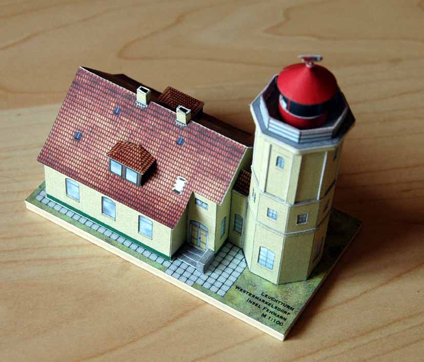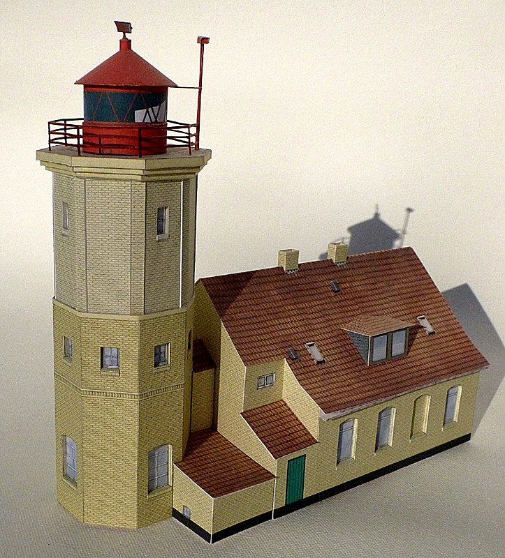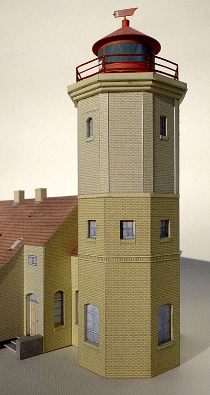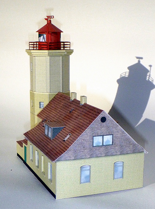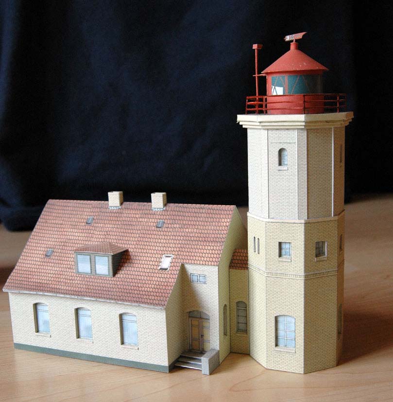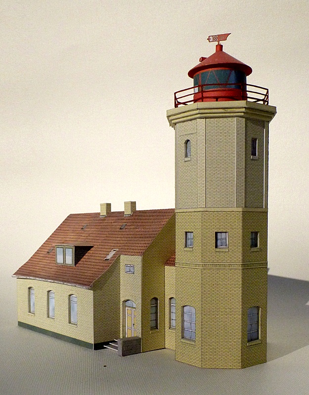 Ein eher untypischer Leuchtturm mit Wärterhäuschen. Dieses Modell ist in beiden Maßstäben auch von ungeübten Modellbauern gut zu bewältigen, wenn man z.B. die zurückgesetzten Fenster weglässt. Passend zum Leuchtturm Westermarkelsdorf gibt es auch die anderen Fehmaraner Leuchttürme: Staberhuk, Flügge und Strukkamphuk