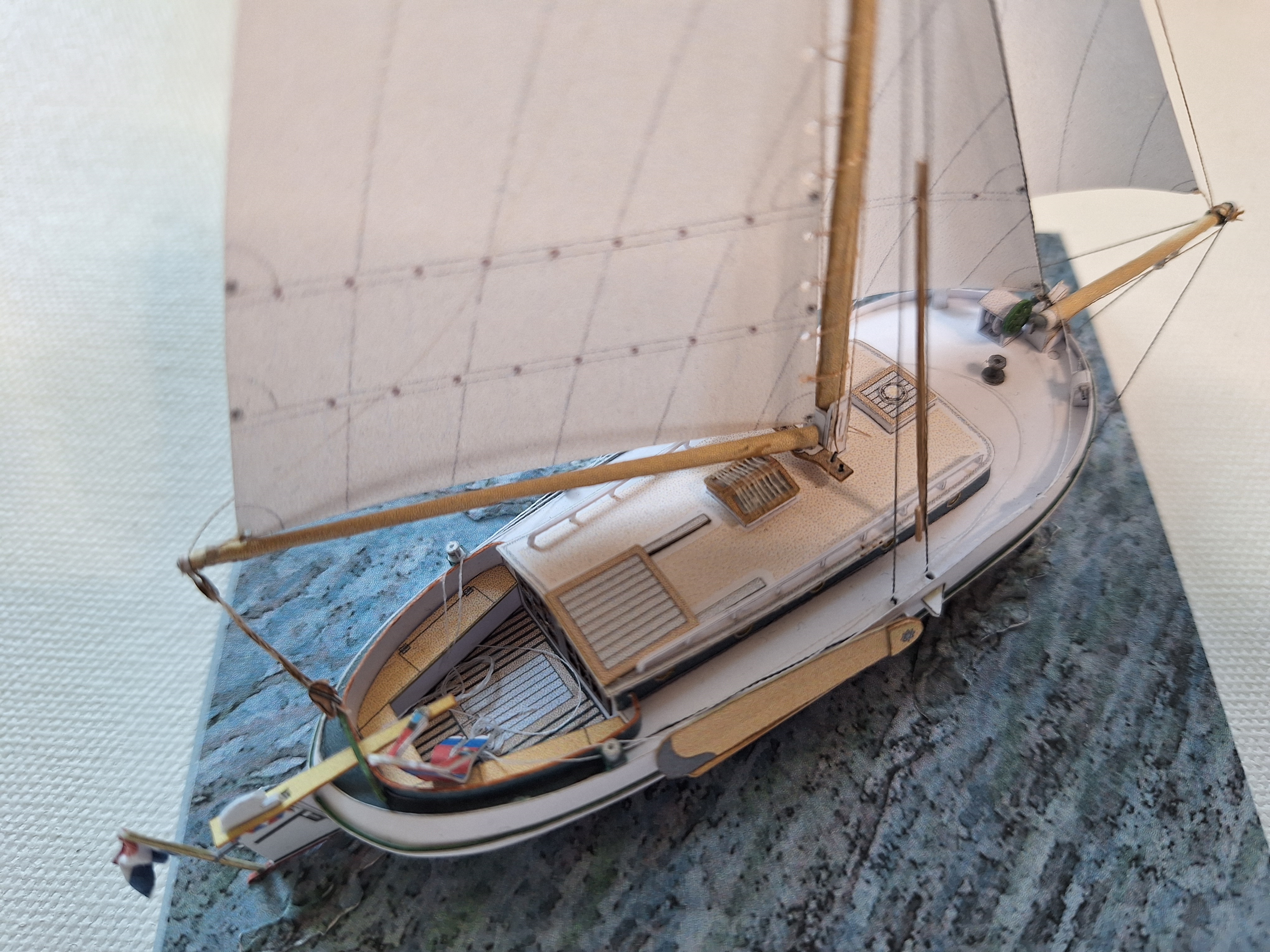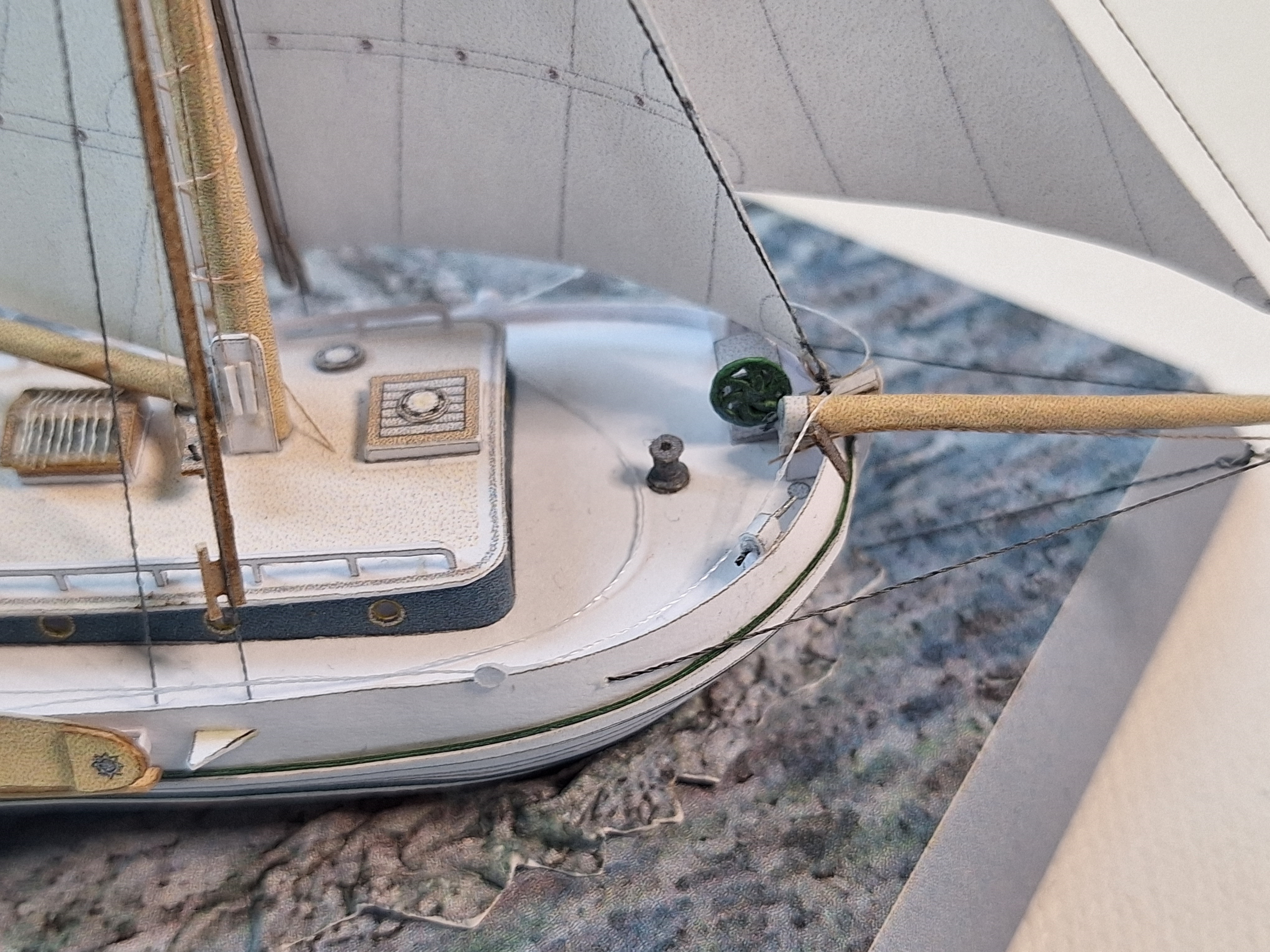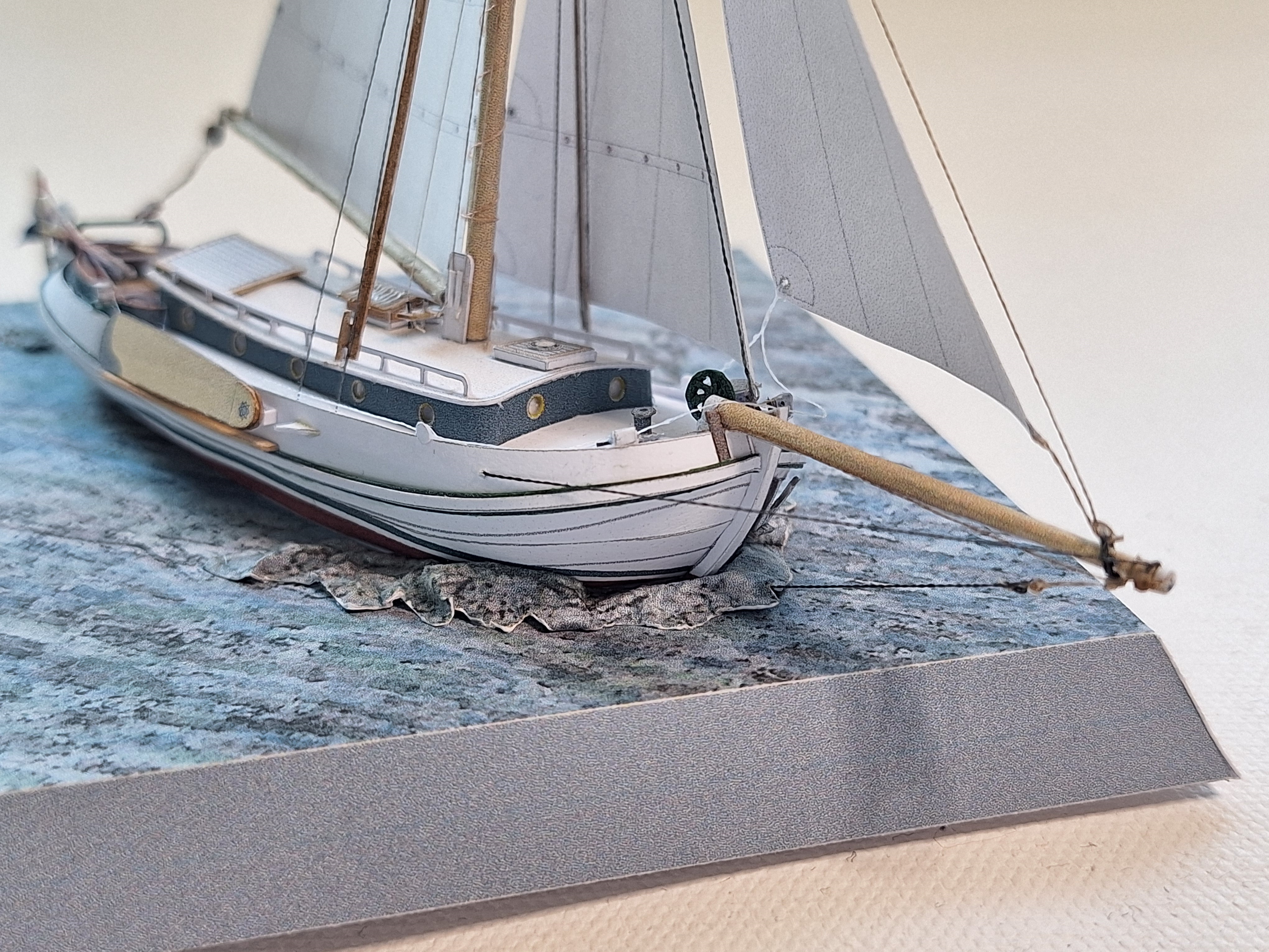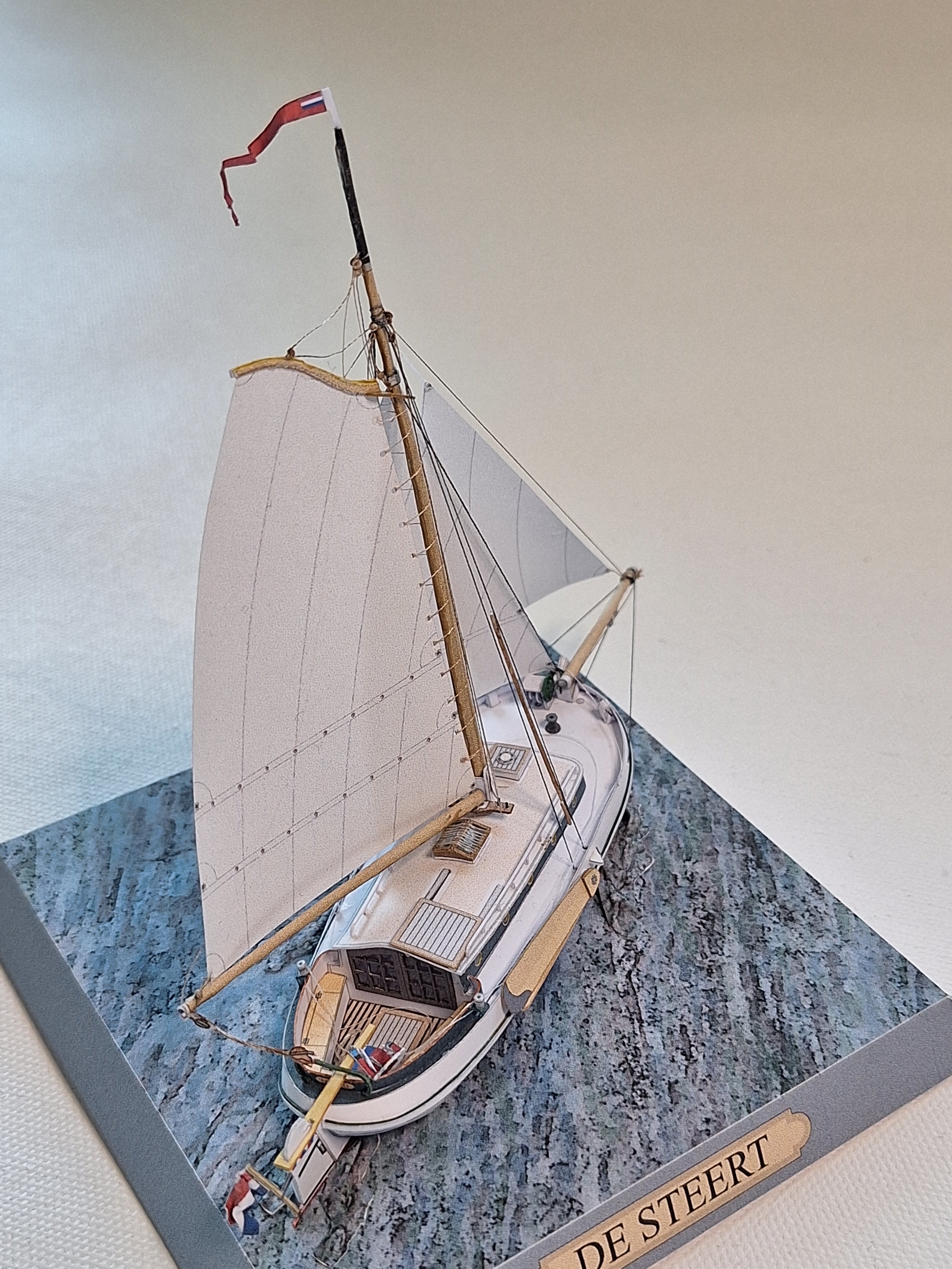 Nach der süßen Krullebol durfte ich im folgenden Jahr zwei Wochen auf der wunderschönen Lemsteraak de Steert verbringen. Die logische Konsequenz daraus war natürlich auch ein Kartonmodell zu machen. De Steert ist im Maßstab 1:100 ein schönes detailliertes Modell, das als Vollrumpf, mit gerader oder schräger Wasserlinie gebaut werden kann. Bei einem Modell mit Segeln bevorzuge ich ganz klar die schräge Variante. Dafür sind im Bogen auch die Wasserfläche und Wellenstücke zum anmodellieren enthalten. Die Segel sind auf 80g Papier doppelseitig bedruckt. Wie die Lottie Holly wurde de Steert von der Druckerei Heiber in Schortens im Offset-Verfahren gedruckt.
